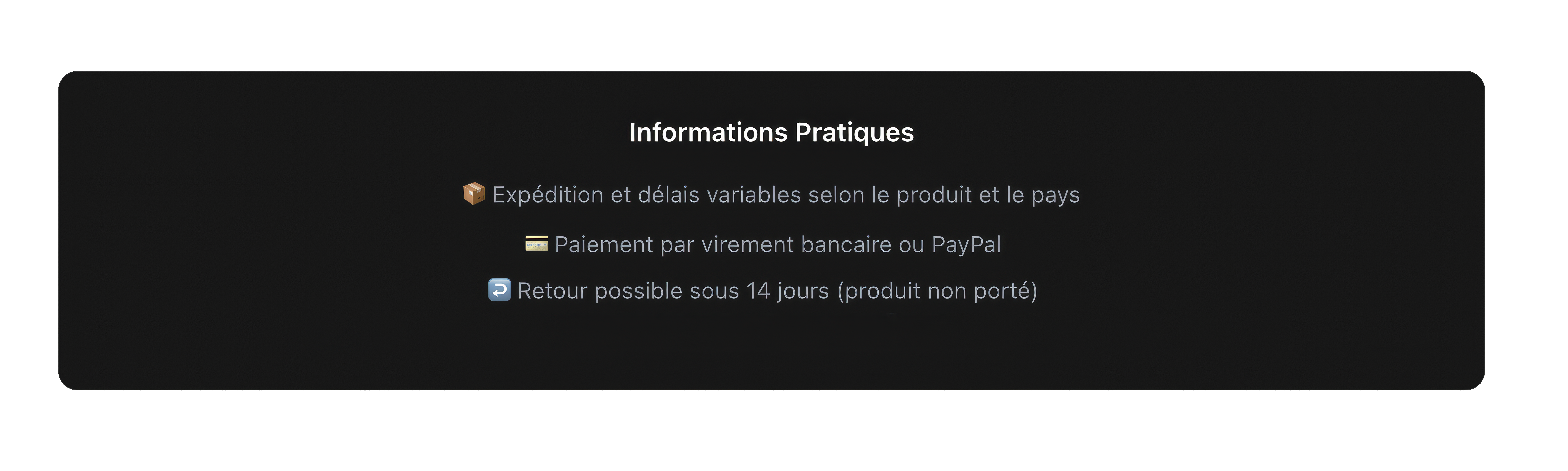 Contactez-moi pour plus d'informations sur les produits, les tailles ou les commandes personnalisées